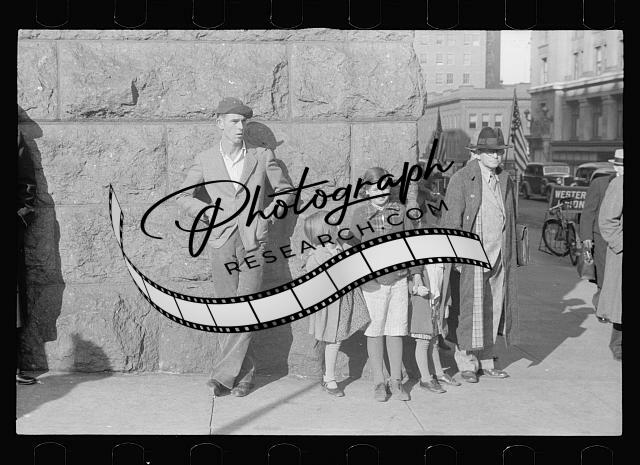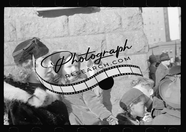 Watching Armistice Day parade,National Bank,crowds,children,Omaha,Nebraska,1938