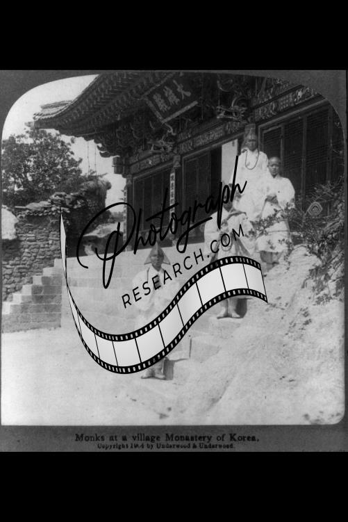 Monks at a village monastery of Korea,c 1904,monks on steps of temple
