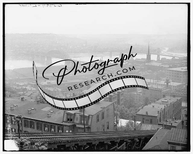 View,Mount Adams,bridge,railroad tracks,buildings,streets,Cincinnati,Ohio,1900