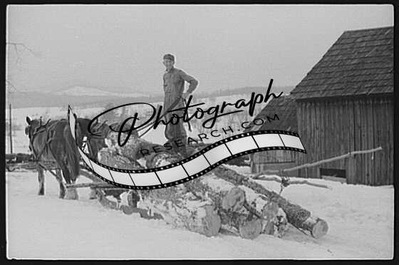 Title: Hired man hauling logs on farm near Waterbury, Vermont. They are then sold to the mill. He said 'There ain't nothin' meaner than a log except a woman when she wants to be. They sure can be stubborn.'