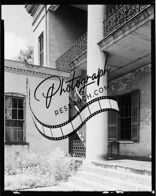 Two story masonry construction. Round stone columns across front. Fine iron work on second story balcony.