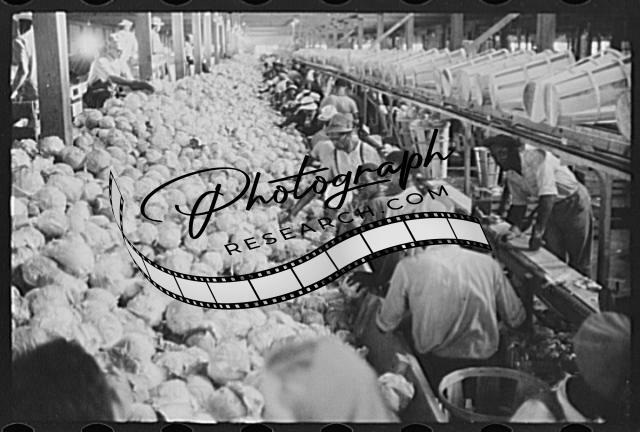 Title: Migratory agricultural workers grading cabbages at the Webster Canning Company, Cheriton, Virgina