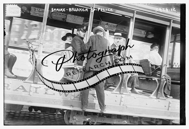 Strike breakers,police,trolley car,railway,people,Bain News Service