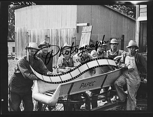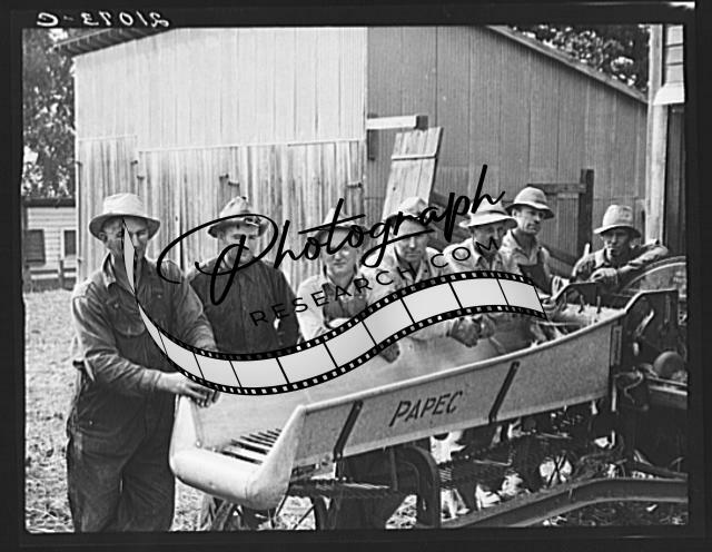 Title: Seven of the eight farmers shown with their cooperatively owned ensilage cutter on the Miller farm, where they are working filling the silo. West Carlton, Yamhill County, Oregon. General caption number 58