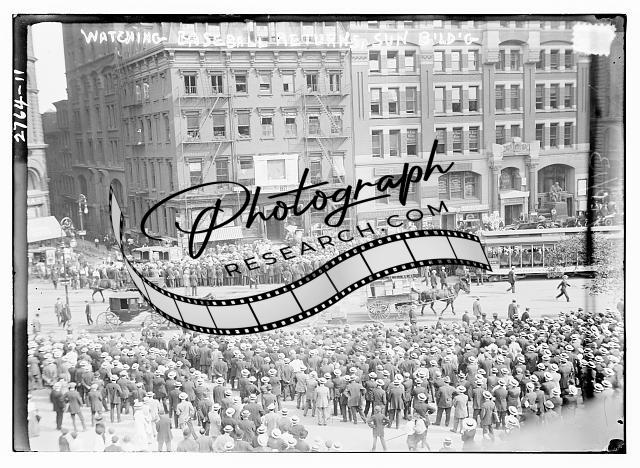 Watching Baseball Returns,Sun Building,1912,crowd gathered,horse drawn carriages
