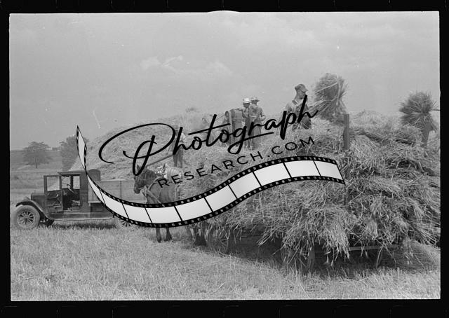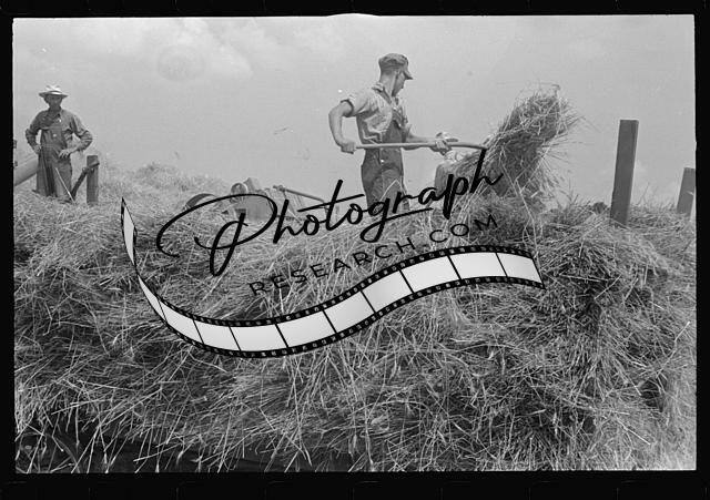 Wheat straw being piled by cyclone stacker,central Ohio,OH,Summer 1938,FSA