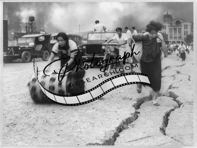 Japanese fleeing,panic,earth,split underfoot,earthquake,Fukui,Honshu Island,1948