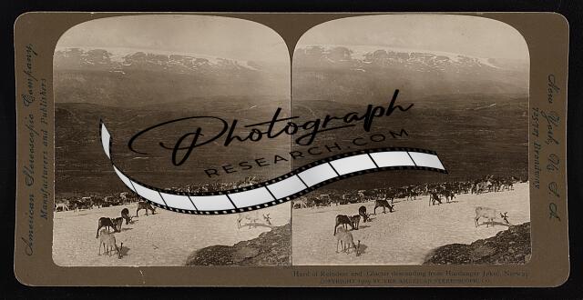 Herd of reindeer and glacier descending from Hardanger Jokul, Norway