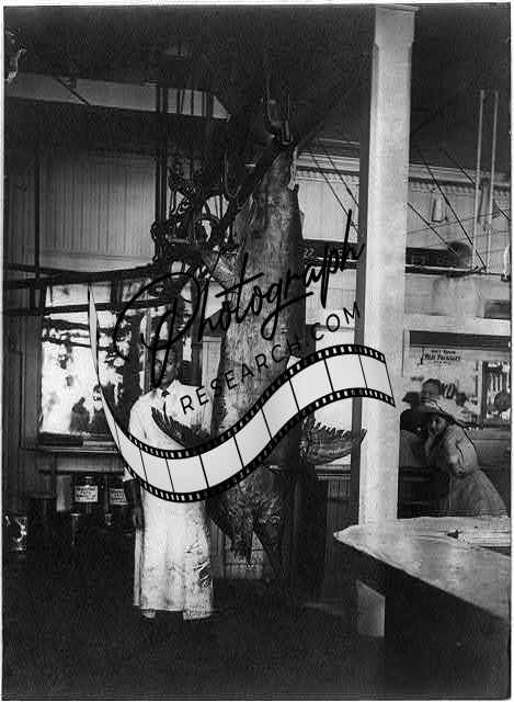 Giant swordfish caught at Los Angeles,ca. 1910,man posed next to hanging fish