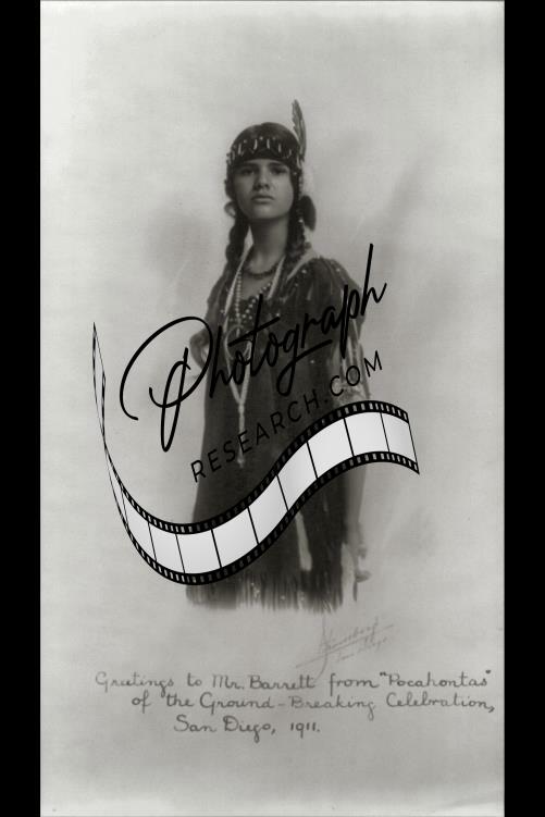 Young woman wearing Indian costume,Greetings to Mr Barett from Pocahontas,1911