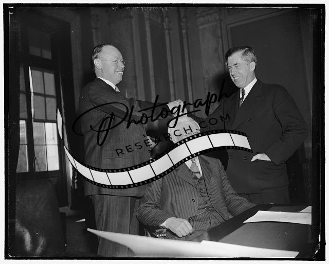 Title: White House callers. Washington, D.C., March 16. British Ambassador Sir Ronald Lindsay, right, with Lord Harlech whom he presented to President Roosevelt in a White House visit, 3-16-39