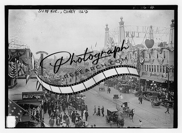 Surf Avenue,Coney Island,New York,1910-1915,people,automobiles,US Flags,horses
