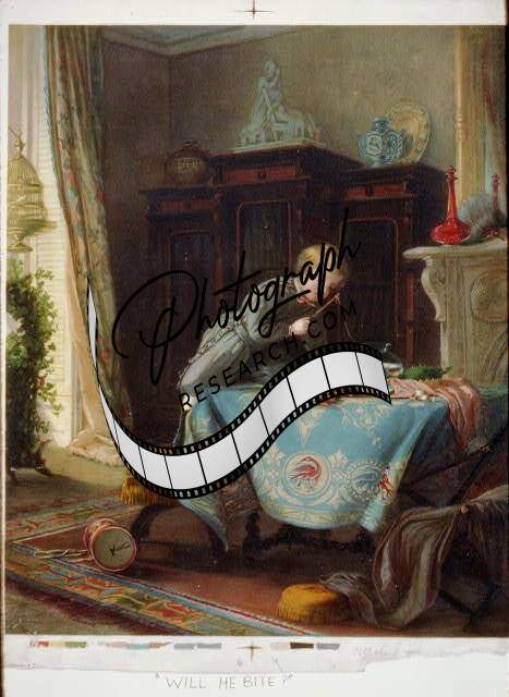 Will he bite?,c1868,Currier & Ives Photo,boy fishing in fish bowl,table,inside