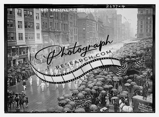 City Employees - N.Y.,New York,1910-1915,parade,umbrellas,buildings,street,rain