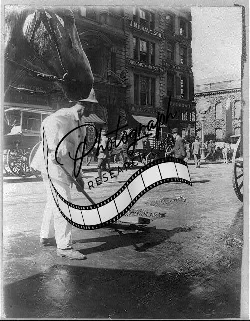 New York City sanitation department employee sweeping street,c1910,NYC,horse