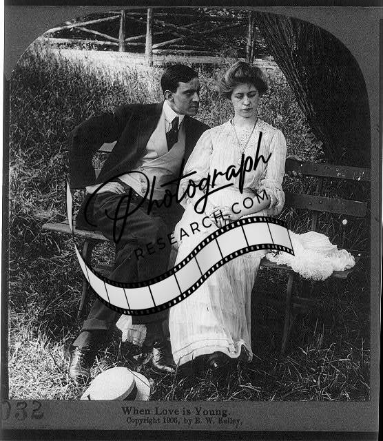 When love is young,c 1906,couple on bench,countryside,women not happy