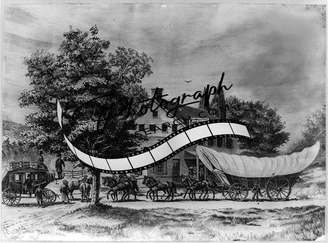 [[Stage coach and covered wagon in front of "The Eagle" inn]]