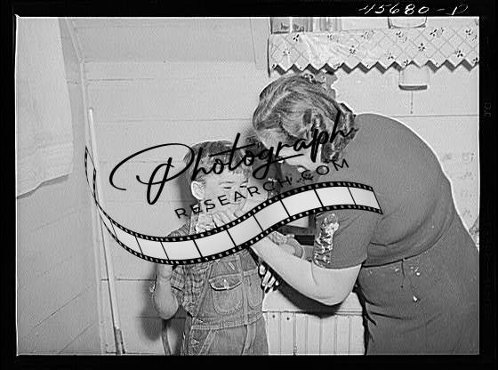 Title: Mrs. Gaynor scrubbing the children's faces before dinner on their farm near Fairfield, Vermont