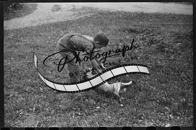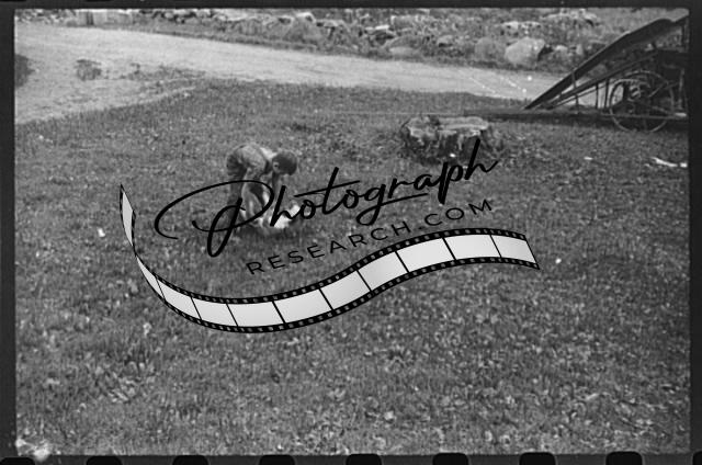Title: One of the children of William Gaynor, FSA (Farm Security Administration) dairy farmer, picking up potatoes on their farm near Fairfield, Vermont
