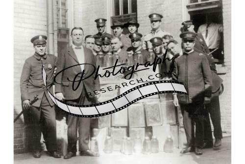 A fair haul by the liquor squad,policemen,cases of moonshine,prohibition,1922