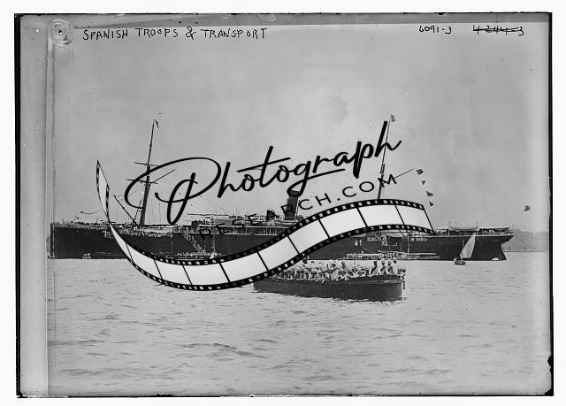 Spanish troops,transport,boats,ships,water vessels,smokestacks,Bain News Service