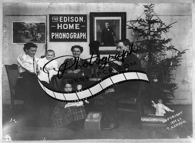 Man,Women,Children listening to phonograph,Christmas Tree,Edison Home Phonograph