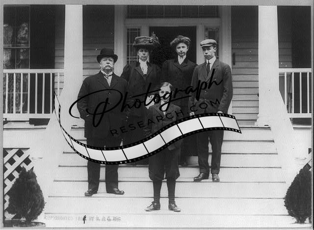 President William Howard Taft,1857-1930,standing with family on porch steps