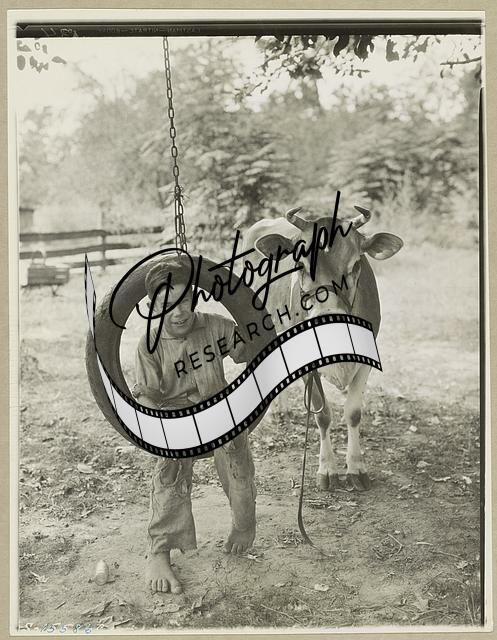Boy in tire swing holds a cow on a tether,1925-1930,Country Life,Livestock