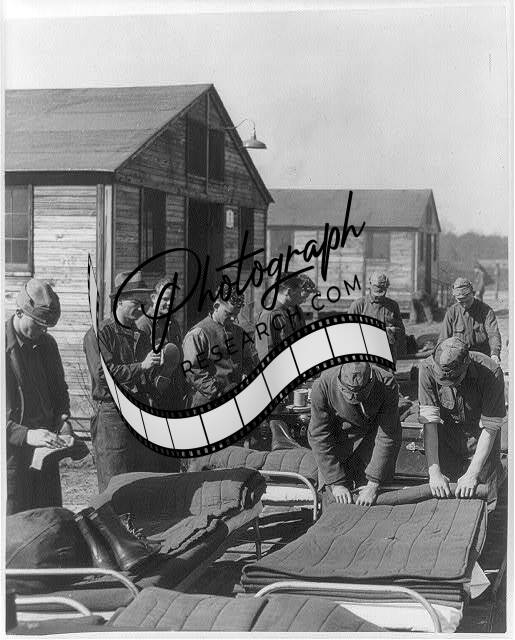 Civilian Conservation Corps workers shining their shoes,making bedrolls,outside