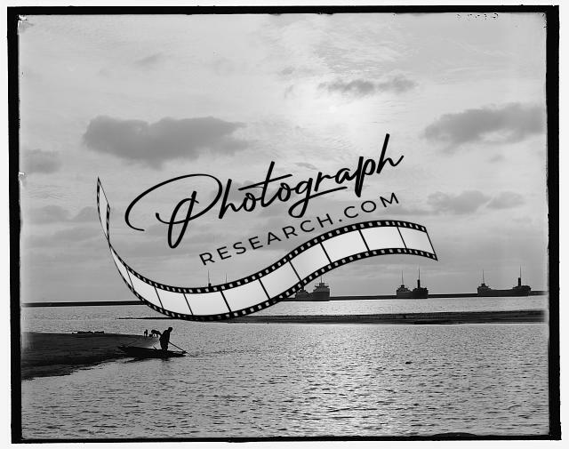 Sunset across harbor,cargo ships,freighters,boats,Buffalo,New York,NY,1900