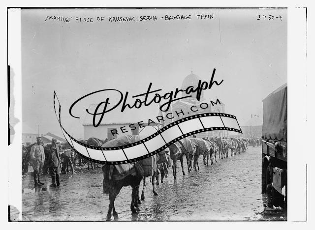 Market Place of Krusevac,Servia -- Baggage Train,horses,men,buildings,Bain News