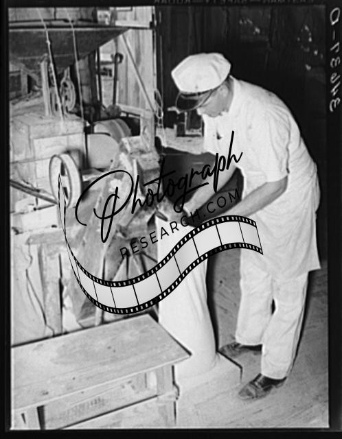 Title: Proprietor of feed mill emptying sack of shelled corn into hopper for grinding into cornmeal. Taylor, Texas