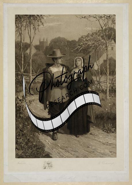 Betrothed,pilgrimage couple walking on path in woods,town,house,Dudensing R.