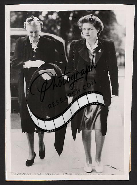 Mrs. Winston Churchill (left), full-length portrait, and her daughter Mary (right), full-length portrait, walking away from their official residence at no. 10 Downing Street, London, England, July 27, 1945 after the Prime Minister's resignation