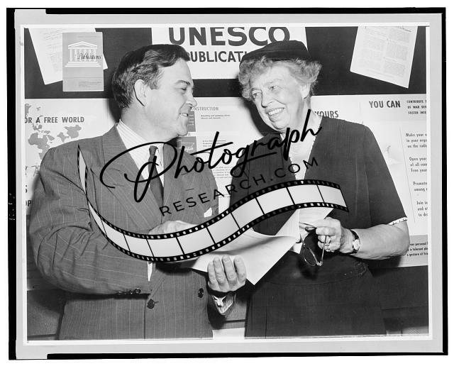 Eleanor Roosevelt and Luther Evans, Librarian of Congress and Commission chairman, half-length portrait, standing, look over the agenda at the second session of the annual meeting of the U.S. National Commission for UNESCO