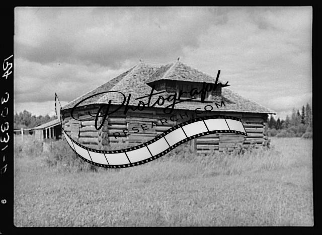 Abandoned log cabin near Gheen,Minnesota,MN,Saint Louis County,1937,FSA