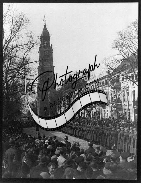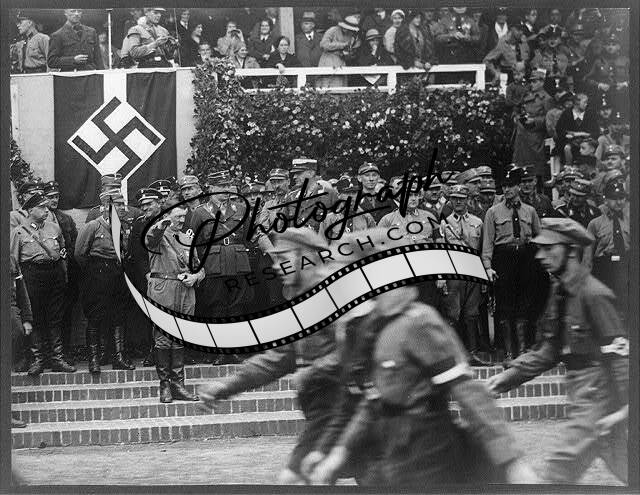 Adolf Hitler saluting and reviewing some of his troops marching past in foregorund; Nazi banner in background