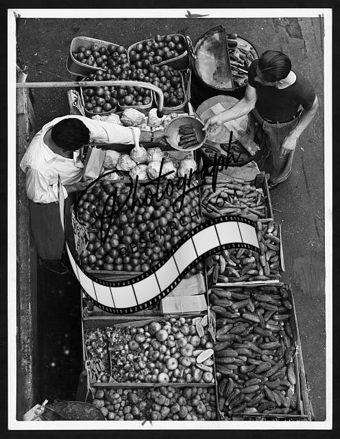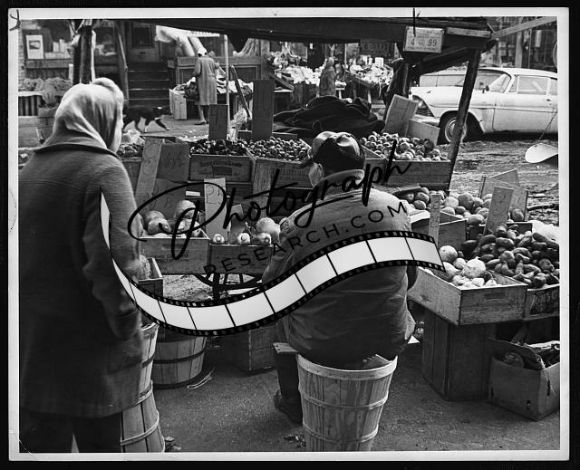 Overhead view of pushcart produce stand,Belmont Avenue,Brooklyn,New York,NY,1962