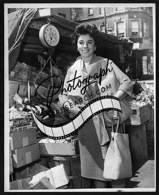 Miss Ellen Lewin shoping in Bleecker Street Market,smiling,1962,holding bags