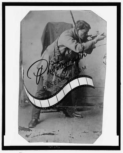 Man with fringed,knitted bag across his chest,shooting rifle,1880-1910,Tintype