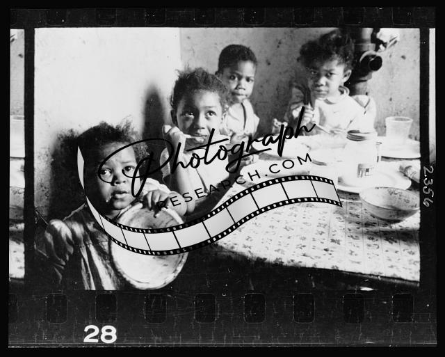 African American children around a table in an apartment,eating,1949,Chicago,IL