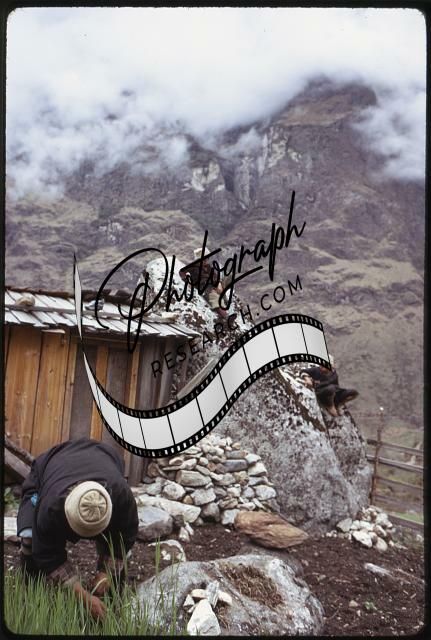 Title: [Woman standing by stone wall near building storing wood, Lachung, Sikkim]