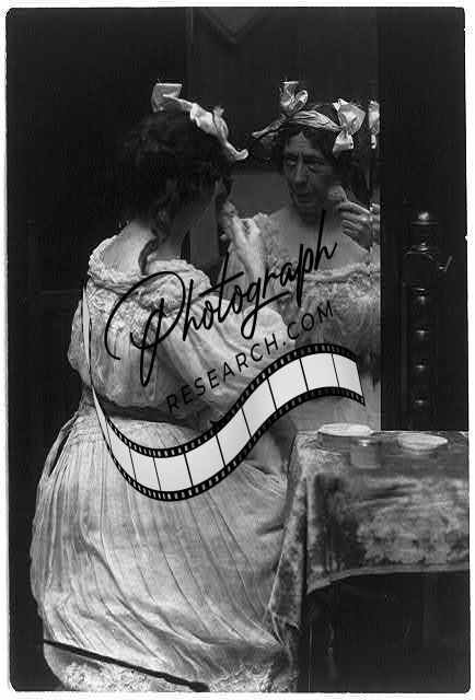 Little daubs of powder,middle-aged woman seated at mirror,using cosmetics,c1909