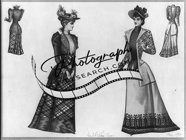 Two women wearing fashionable,dresses; back of one dress is also shown,1892