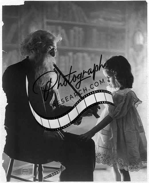 Girl lighting long pipe of old bearded man,c1902,Tobacco,Aged,Child,Fitz Guerin