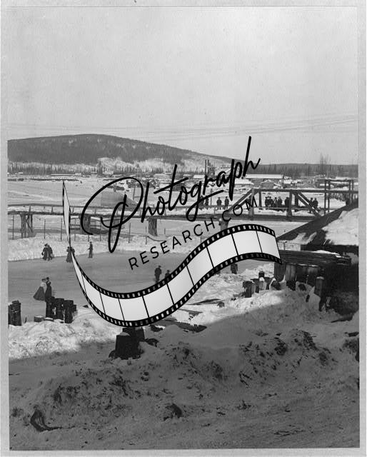 Winter bridge over river,Fairbanks,Alaska,AK,Ice Skating,United States,c1915