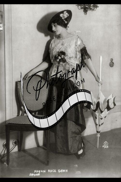 Women's fashions,Paquin race gown,1914,umbrella,hat,woman standing next to chair