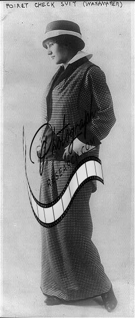 Women's fashion,poiret check suit,hat,woman standing,1914