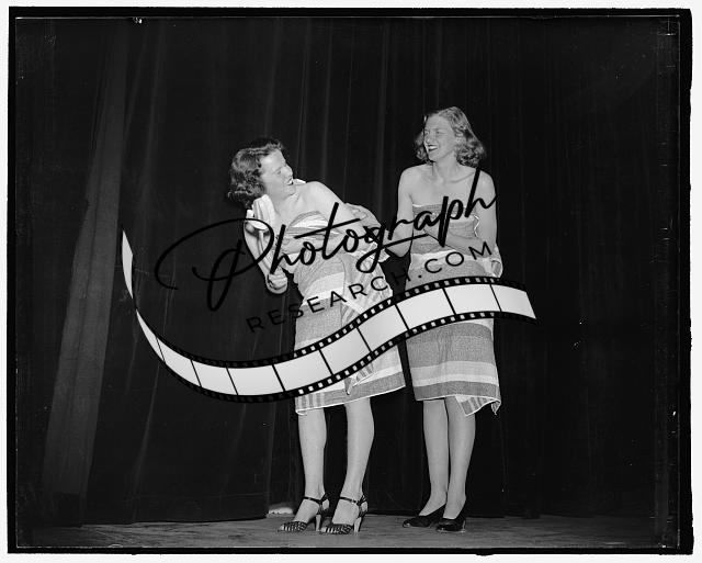 Title: Women's Press Club skit instructs future first ladies on how to get along. 5. Delegates to the nominating convention include 679,342. 1-2 honest to God newspaperwomen, not counting socialite chiselers, meeting to nominate the next first lady who may pick out her own president. All possible ladies are considered. They attempt to discover if 'Mrs. Roosevelt will settle down, if Mrs. Taft is on a diet, and who Mrs. Dewey was. Mary Johnson of Time, city room gal-bab Lincoln, Washington Times-Herald, Club Editor, Corrinne Frazier, WPA, Correspondent, Mrs. Elizabeth May Craig, Portland, Maine, Press-Herald Chairman, Bess Furman, Furman Features, Political Writer, Malvina Lindsay, Washington Post Woman's Page Editor, Hope Riding Miller, The Washington Post Society editor. Do not release before March 11, 1940