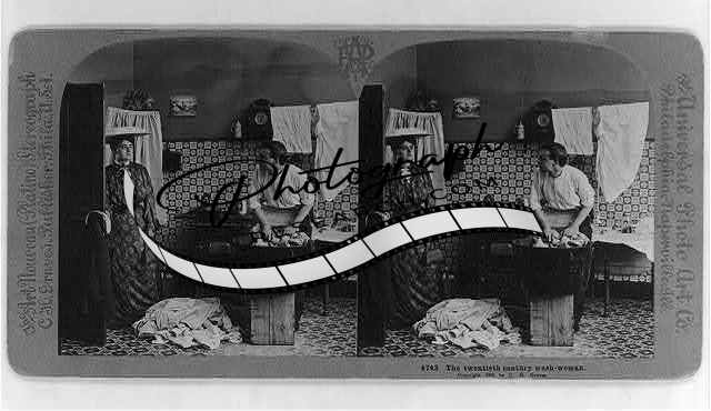 The twentieth century wash-woman,c1905,man doing laundry in tub,woman leaving